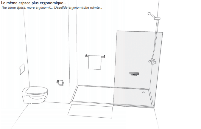 Vous devez avoir sol plat, sans marche. Cela vous permettra de réduire les risque avec un sol linéaire sans écart sans décalage. C’est un conseil simple mais important : Un sol plat réduit de 35% le risque de chute d’en votre salle de bains.